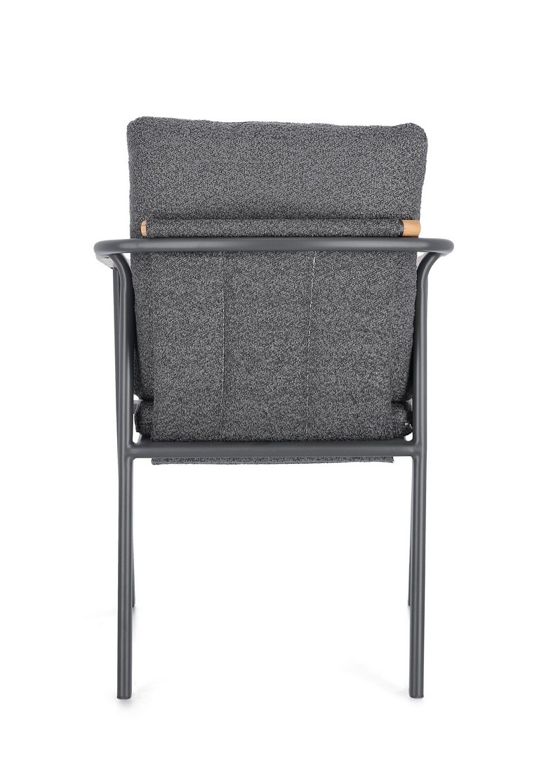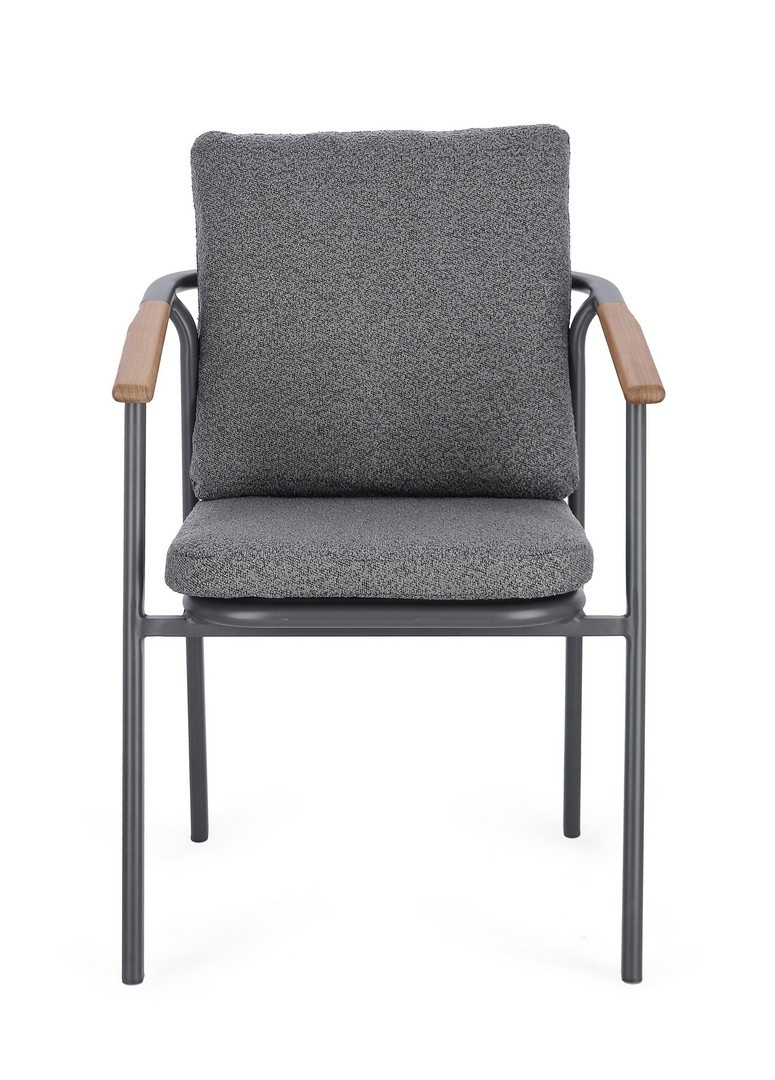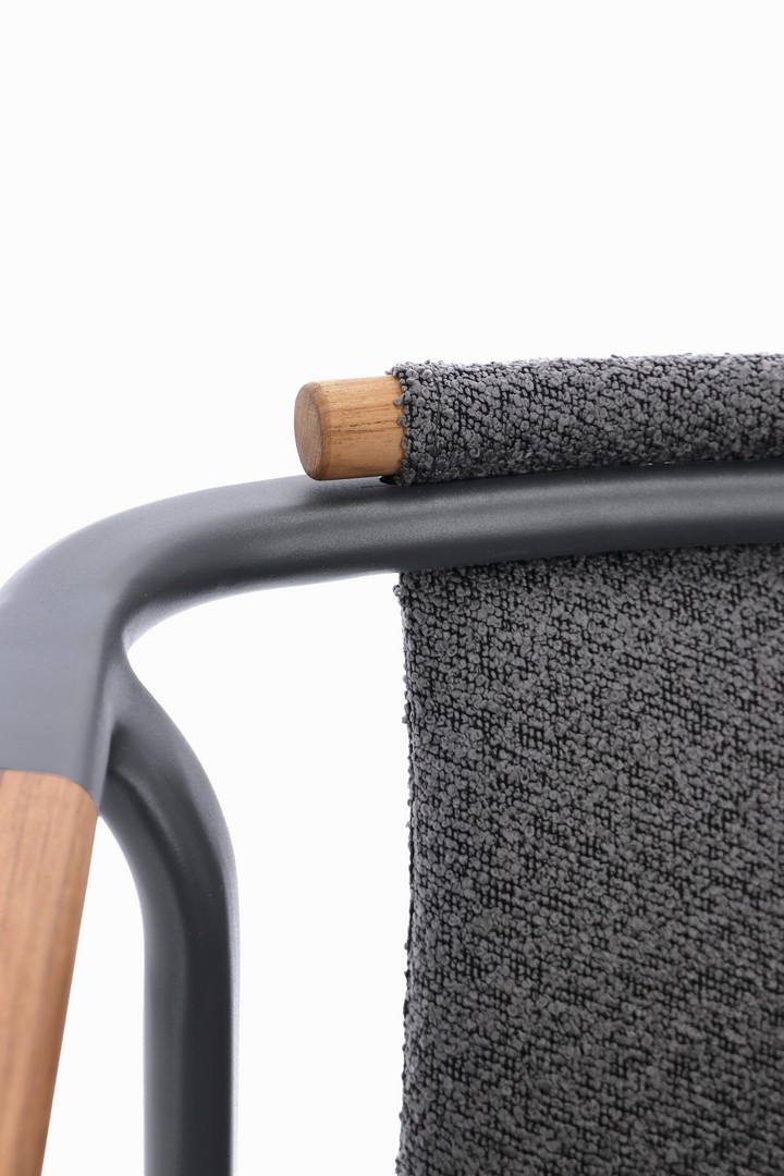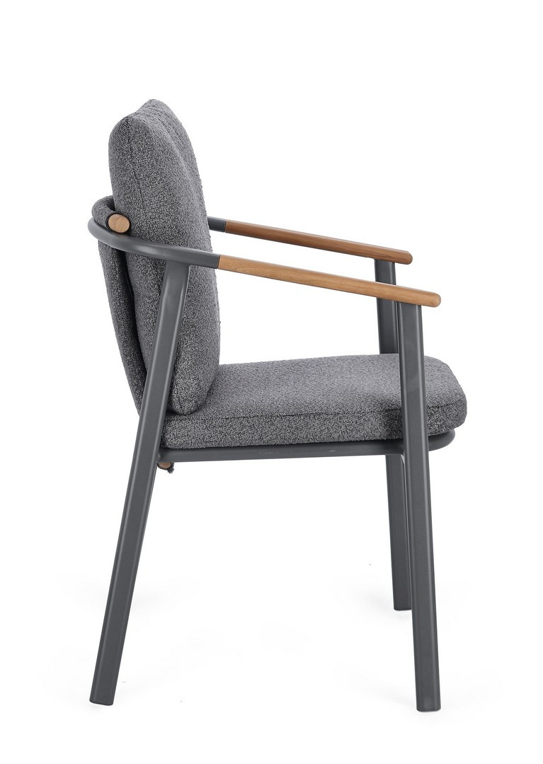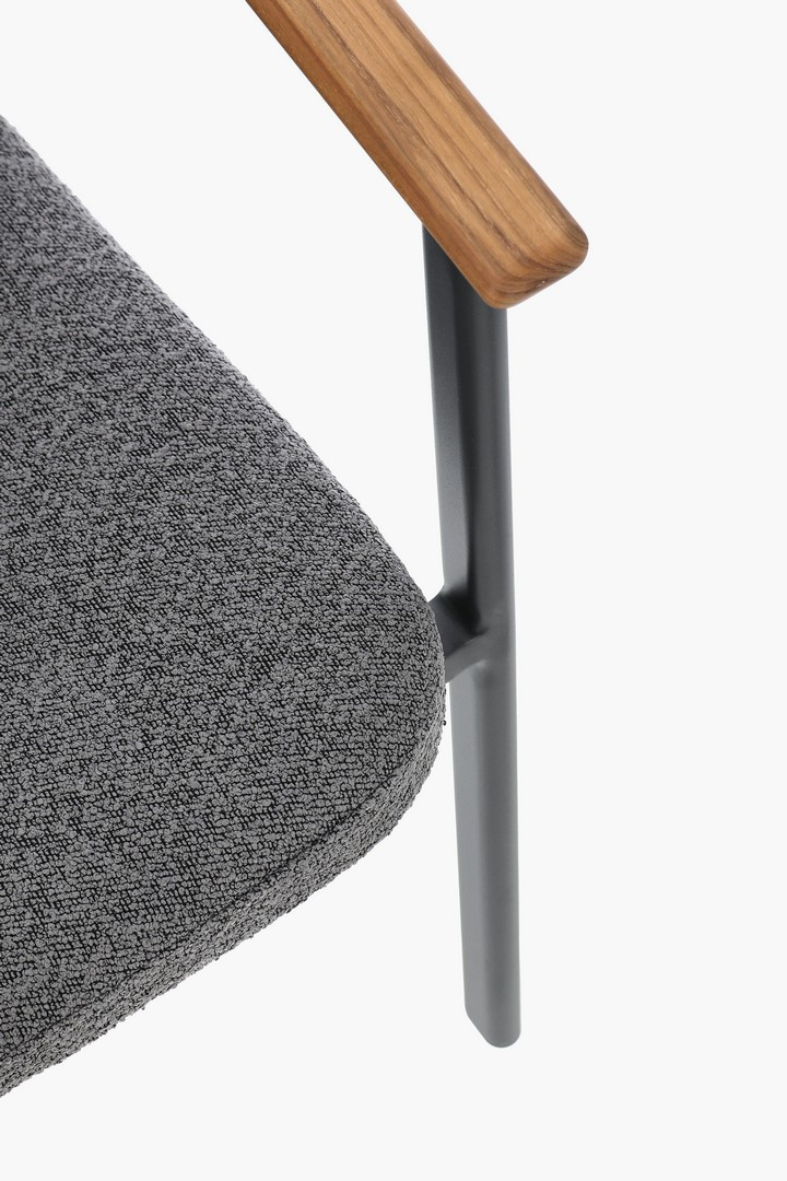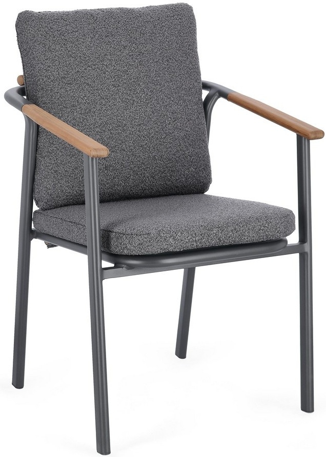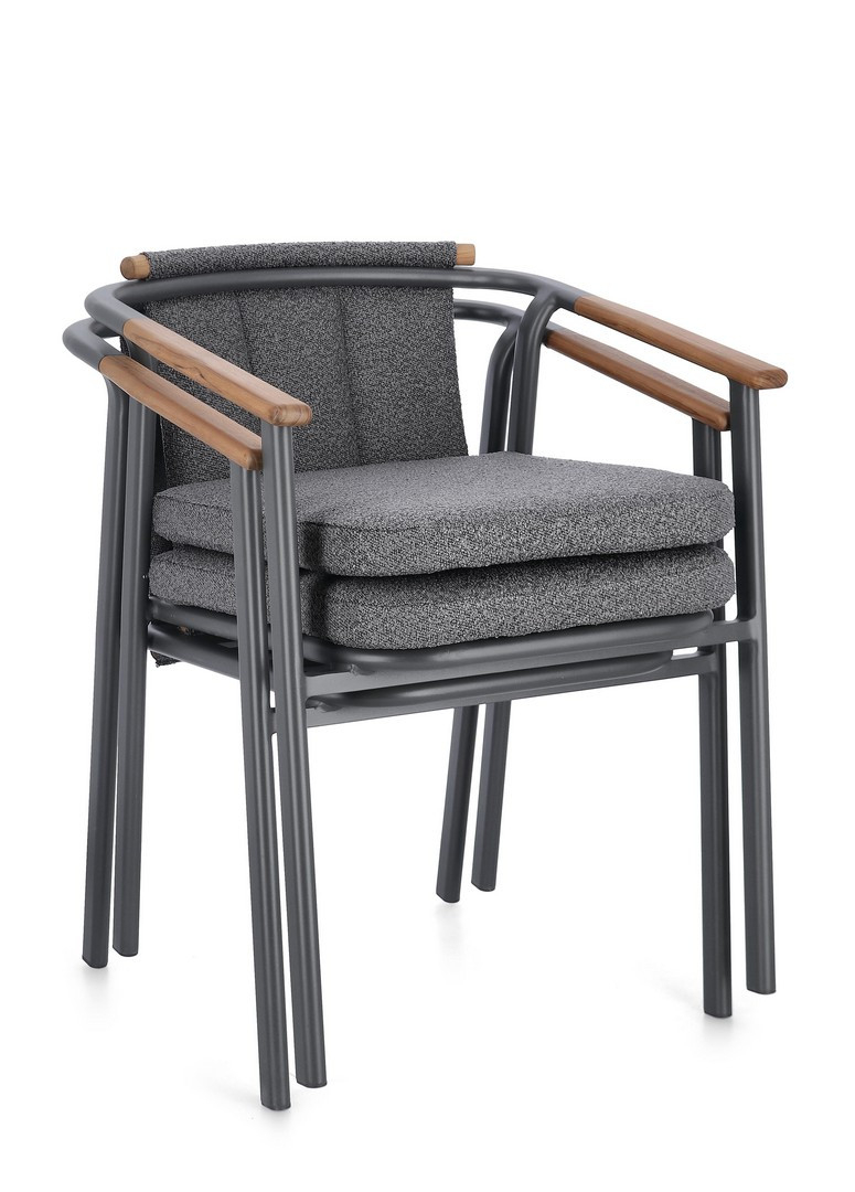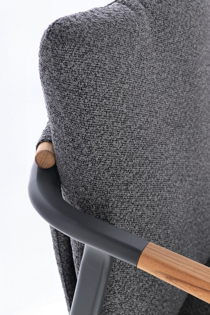 Leonida - элегантное кресло, в котором современный минимализм встречается с природным теплом. Основой модели служит прочный каркас из алюминия с долговечным порошковым покрытием, дополненный изысканными вставками из натурального тикового дерева на подлокотниках и спинке. Особую текстуру и уют интерьеру придает обивка из инновационной водоотталкивающей олефиновой ткани с актуальным эффектом букле. Съемные мягкие подушки, выполненные из того же материала, обеспечивают максимальный комфорт для гостей и простоту в обслуживании.