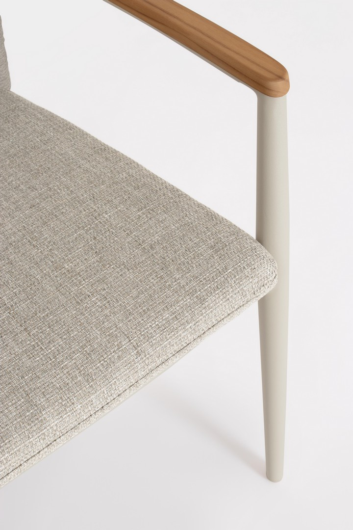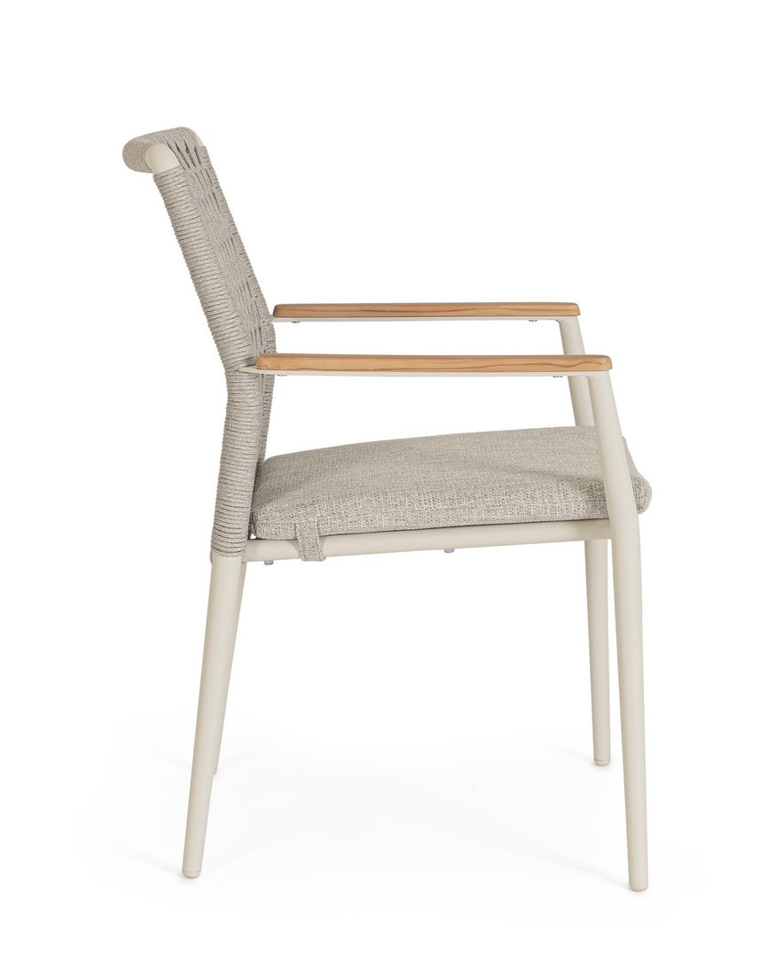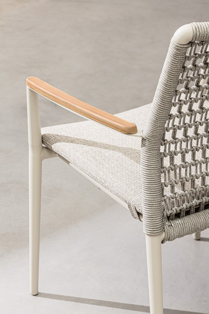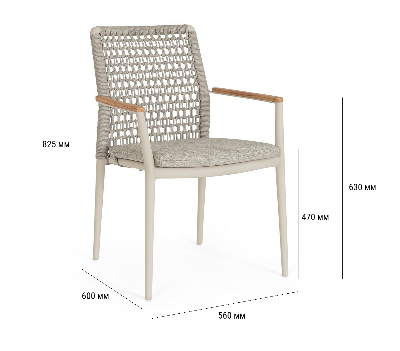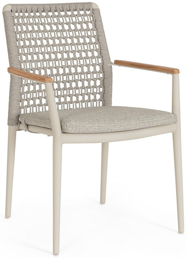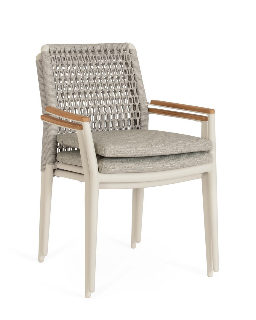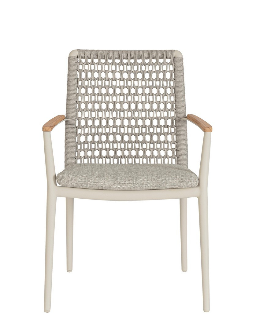 Maddox - элегантное кресло, в котором современные материалы гармонично сочетаются с природной теплотой натурального дерева. Прочный каркас из алюминия с порошковым покрытием обеспечивает исключительную долговечность и устойчивость к любым погодным условиям, а изысканные вставки из тикового дерева на подлокотниках придают модели благородный внешний вид. Спинка с плетением из олефиновой веревки создает эффектный визуальный рисунок, а съемная подушка из водоотталкивающей олефиновой ткани обеспечивает комфорт и проста в уходе.