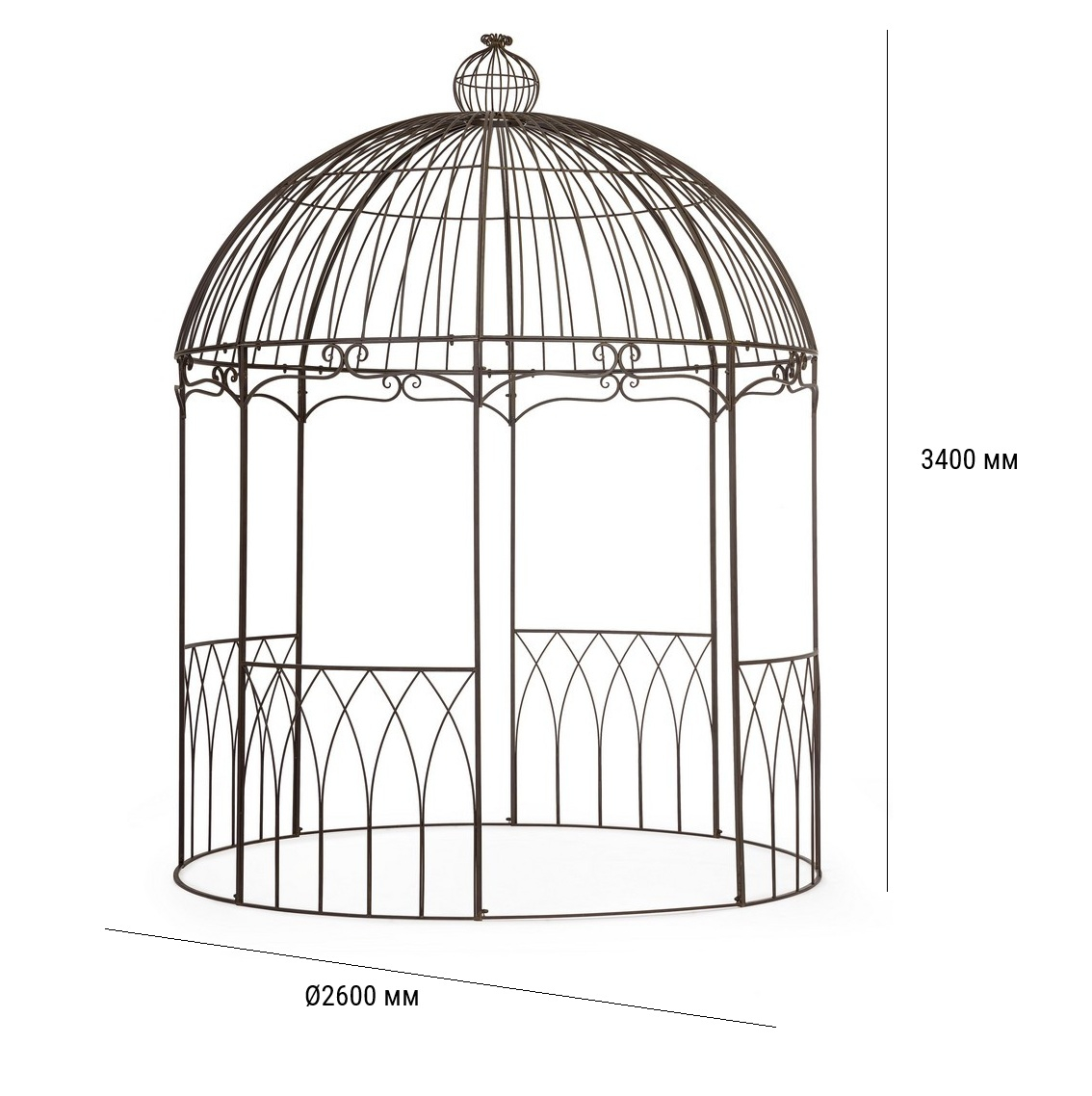 Brumal - изысканная беседка, которая станет эффектным архитектурным акцентом вашего сада или приусадебного участка. Конструкция изготовлена из прочной стали с долговечным порошковым покрытием, обеспечивающим высокую устойчивость к коррозии и любым погодным условиям. Утонченный дизайн с куполообразной крышей, увенчанной декоративным финалом, и изящные готические арки в нижней части создают атмосферу романтической элегантности. Декоративные завитки и ажурный металлический каркас придают модели особый шарм и визуальную легкость.
