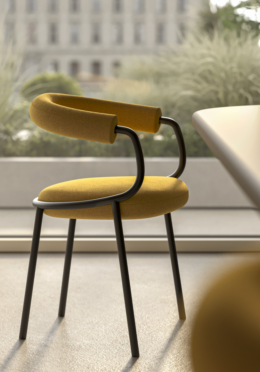 Koala переосмысляет классическое кресло-ванну через язык графичного минимализма. Его конструкция строится вокруг выразительного трубчатого кольца: этот элемент не только формирует посадочное место и поддерживает спинку, но и задает динамичный поток линий, в которых легкость металла уравновешивает щедрую объемность мягкой части. Благодаря продуманной эргономике и мягкой обивке, кресло дарит фирменное чувство защищенности, не теряя визуальной воздушности.
