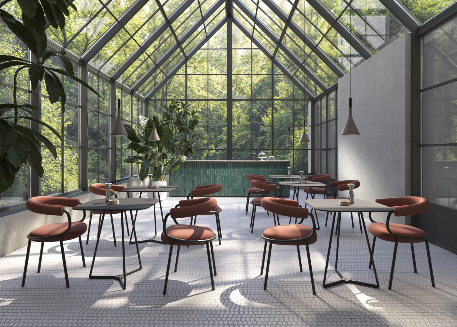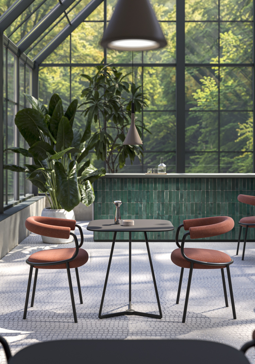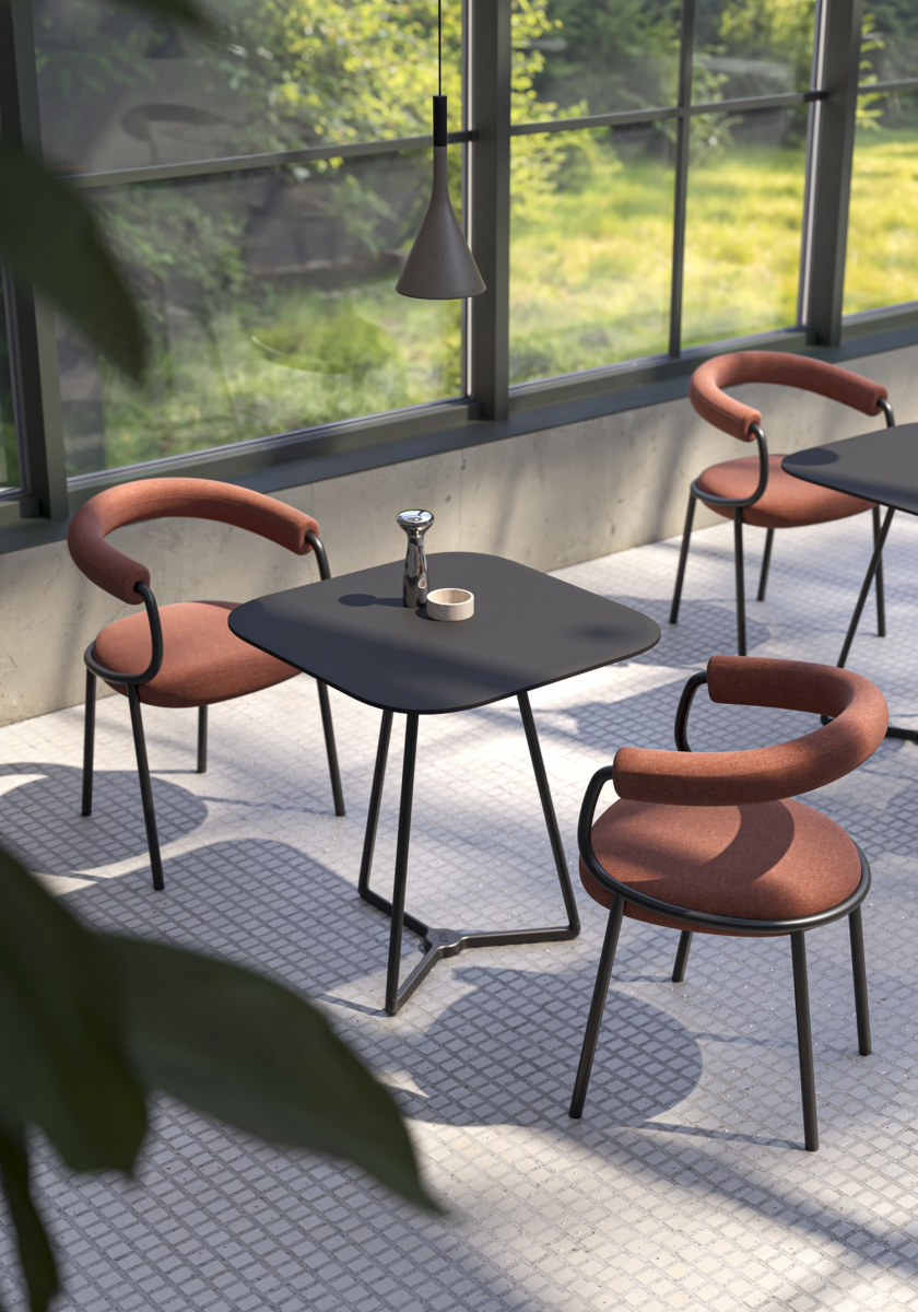 Koala переосмысляет классическое кресло-ванну через язык графичного минимализма. Его конструкция строится вокруг выразительного трубчатого кольца: этот элемент не только формирует посадочное место и поддерживает спинку, но и задает динамичный поток линий, в которых легкость металла уравновешивает щедрую объемность мягкой части. Благодаря продуманной эргономике и мягкой обивке, кресло дарит фирменное чувство защищенности, не теряя визуальной воздушности.