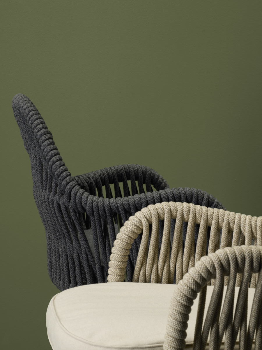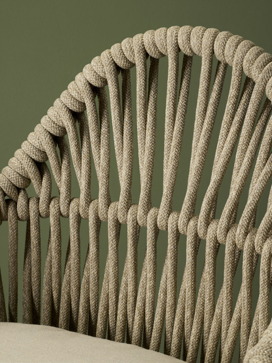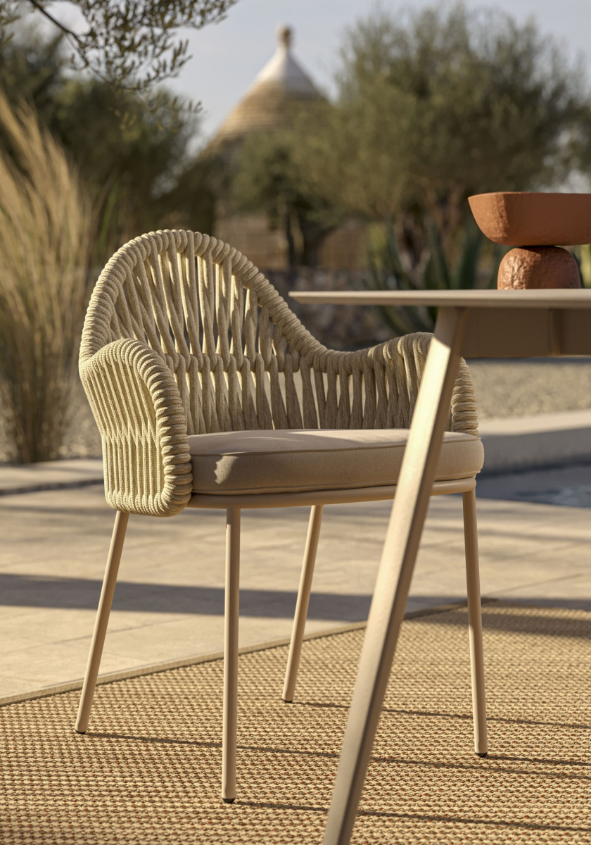 Malvasia Riviera переосмысляет философию уличного отдыха, смещая акцент с индустриальной структуры на природную теплоту. В отличие от оригинальной модели Malvasia с её строгим металлическим плетением, новая версия представляет каркас с изящной веревочной спинкой - она наполняет силуэт мягкостью и естественным ритмом. Щедрые подлокотники и глубокое посадочное место формируют мгновенное ощущение комфорта, а сама конструкция словно сплетена из воздуха: продуманное переплетение веревок в тон создает иллюзию свежего бриза, даря долгожданную прохладу в летний зной.