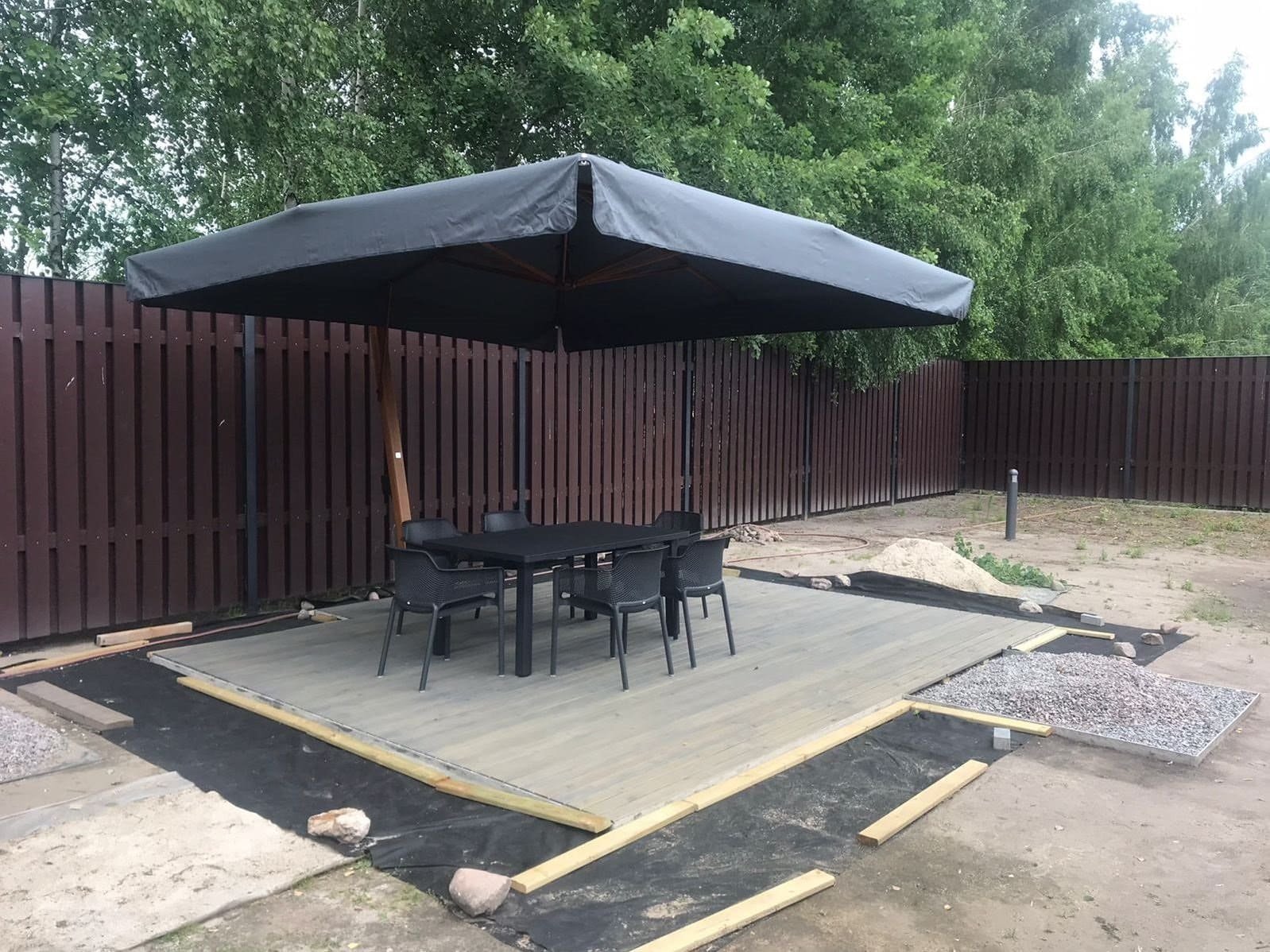 Материал каркаса: вертикальная опора выполнена из дерева ироко с пропиткой, горизонтальная опора - из алюминия, окрашенного в цвет антрацит.