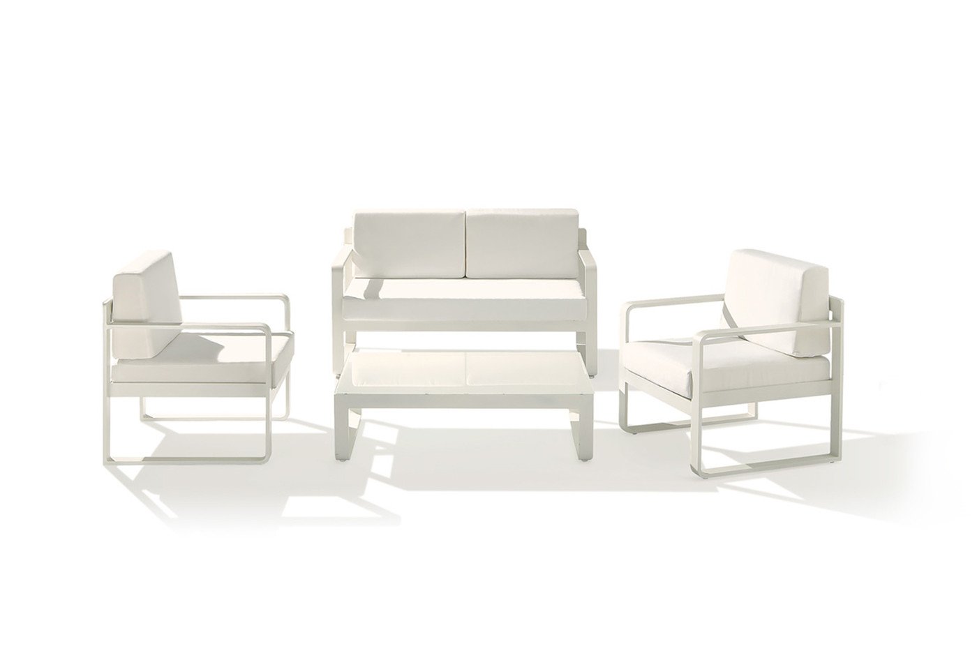 Комплект Capri состоит из дивана, кресел и журнального столика. Каркас мебели выполнен из алюминия с порошковым покрытием, подушки на диване и креслах - из стойкого к истиранию и ультрафиолетовому излучению олефина, столешница журнального столика - из стекла. Такой комплект украсит лаунж-зону возле бассейна или на террасе загородного дома.