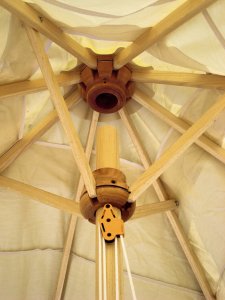 Каркас зонта выполнен из окрашенной твердой древесины кото высокого качества, купол может быть выполнен из натурального или окрашенного акрила, Tempotest Para или ПВХ. Все ткани имеют высокую стойкость к выцветанию, что обеспечивает долгий срок службы.