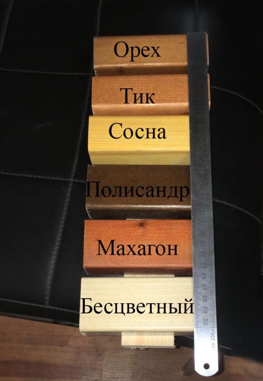 Стандартная палитра древесины представлена на фото, эти цвета доступны для заказа при изготовлении изделий до 50 ед. Она включает в себя следующие цвета: бесцветный, белый, сосна, дуб, орех, махагон, тик, палисандр.