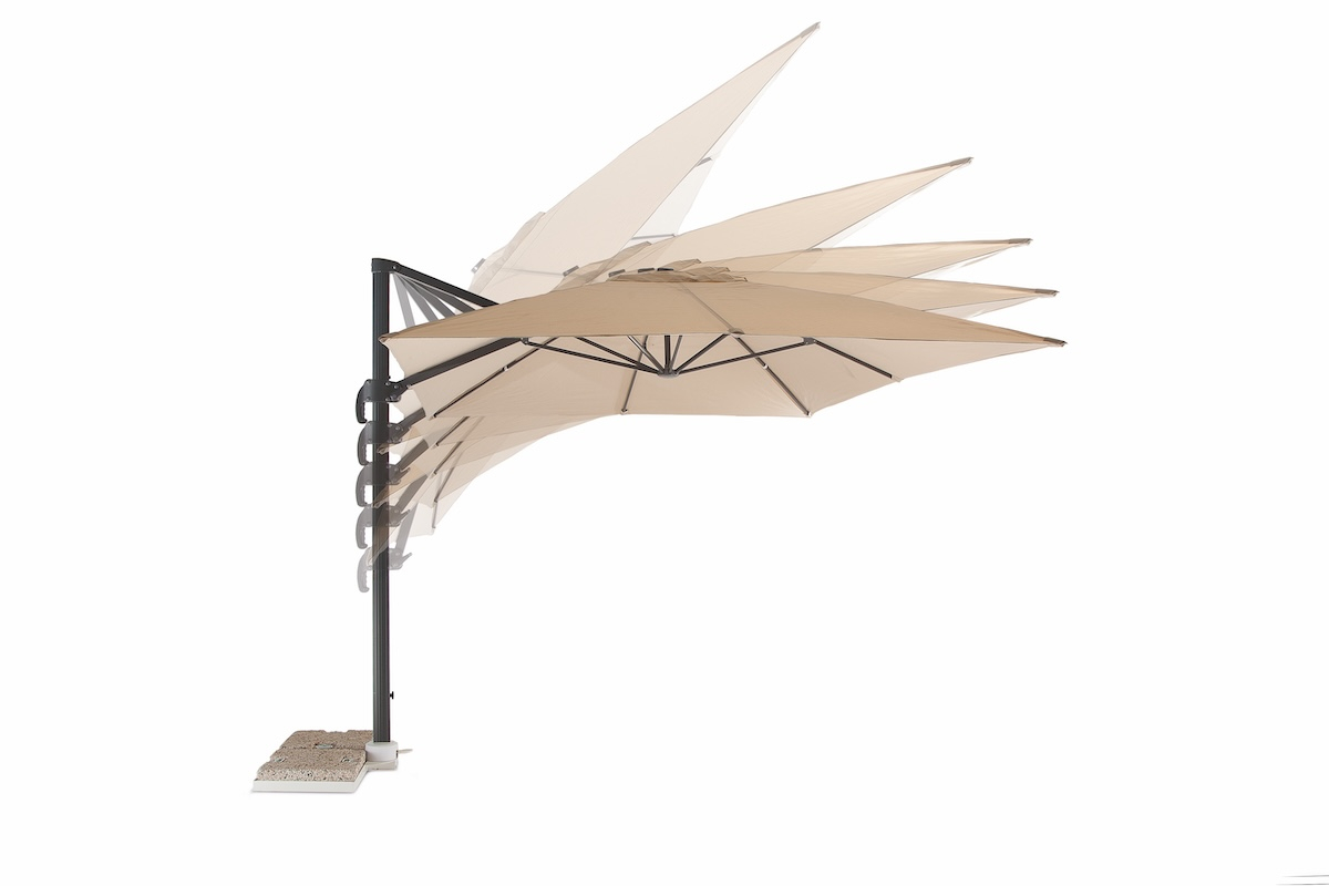 Зонт с боковой опорой Trieste выполнен в современном дизайне из высококачественных материалов и превосходно подойдет для использования на улице в кафе или ресторане. Уличный зонт имеет уникальный поворотный механизм, который позволяет поворачивать зонт в любом направлении на 360 градусов. Каркас зонта выполнен из алюминия, который не подвержен коррозии и не меняет своих свойств под воздействием низких или высоких температур. Купол выполнен из ткани олефин - синтетическая ткань, имеющая устойчивость окраски, стойкость к трению, плесени, химическим веществам и загрязнению.