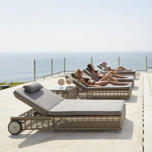 Плетеный лежак Castries из искусственного ротанга цвета Kubu Mushroom и матрасом из ткани Sunbrella. Современные чёткие линии, формы и невесомость плетения делают эту коллекцию универсальной, а модульная система создаёт множество вариантов для композиций.