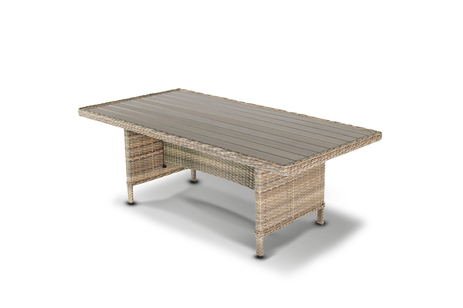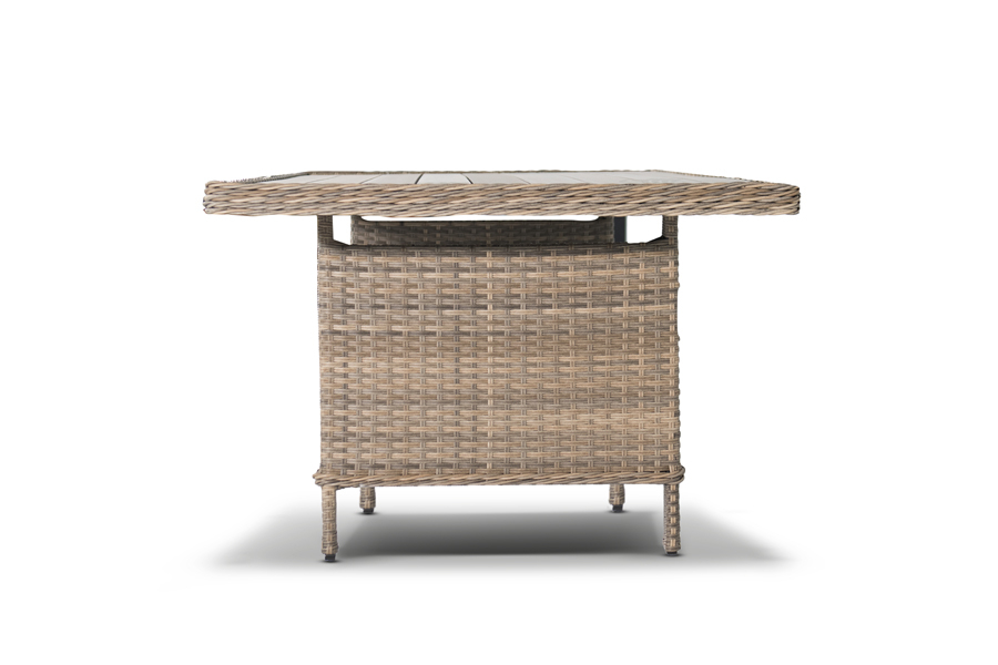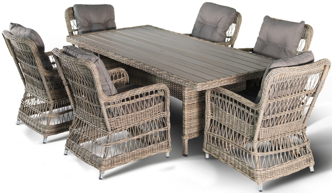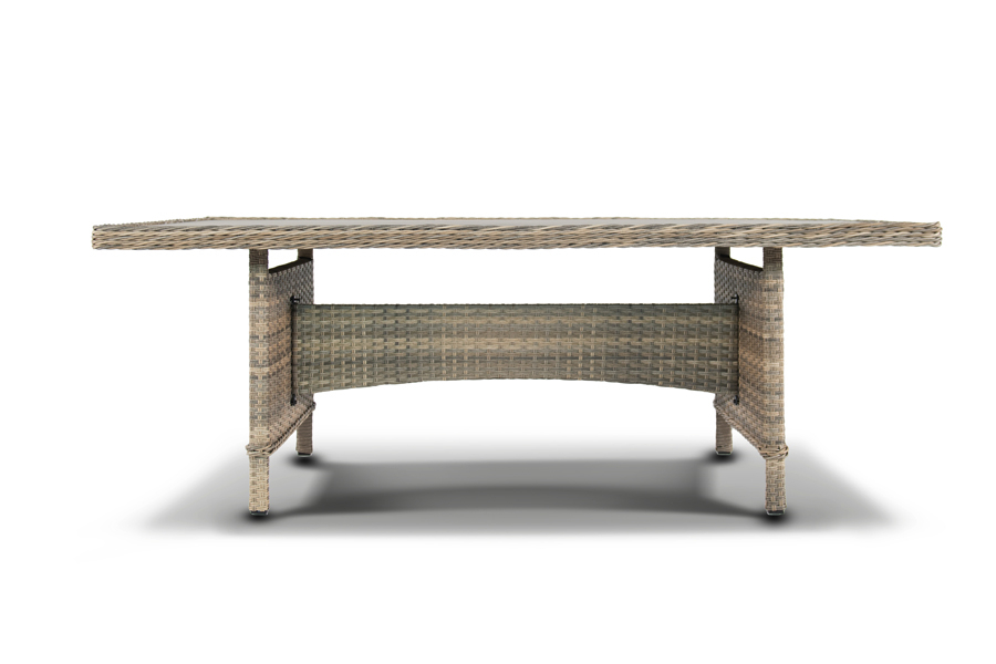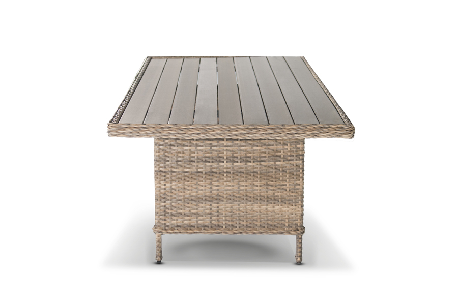 Вместительный круглый стол выполнен из алюминиевого каркаса, оплетенного искусственным ротангом.